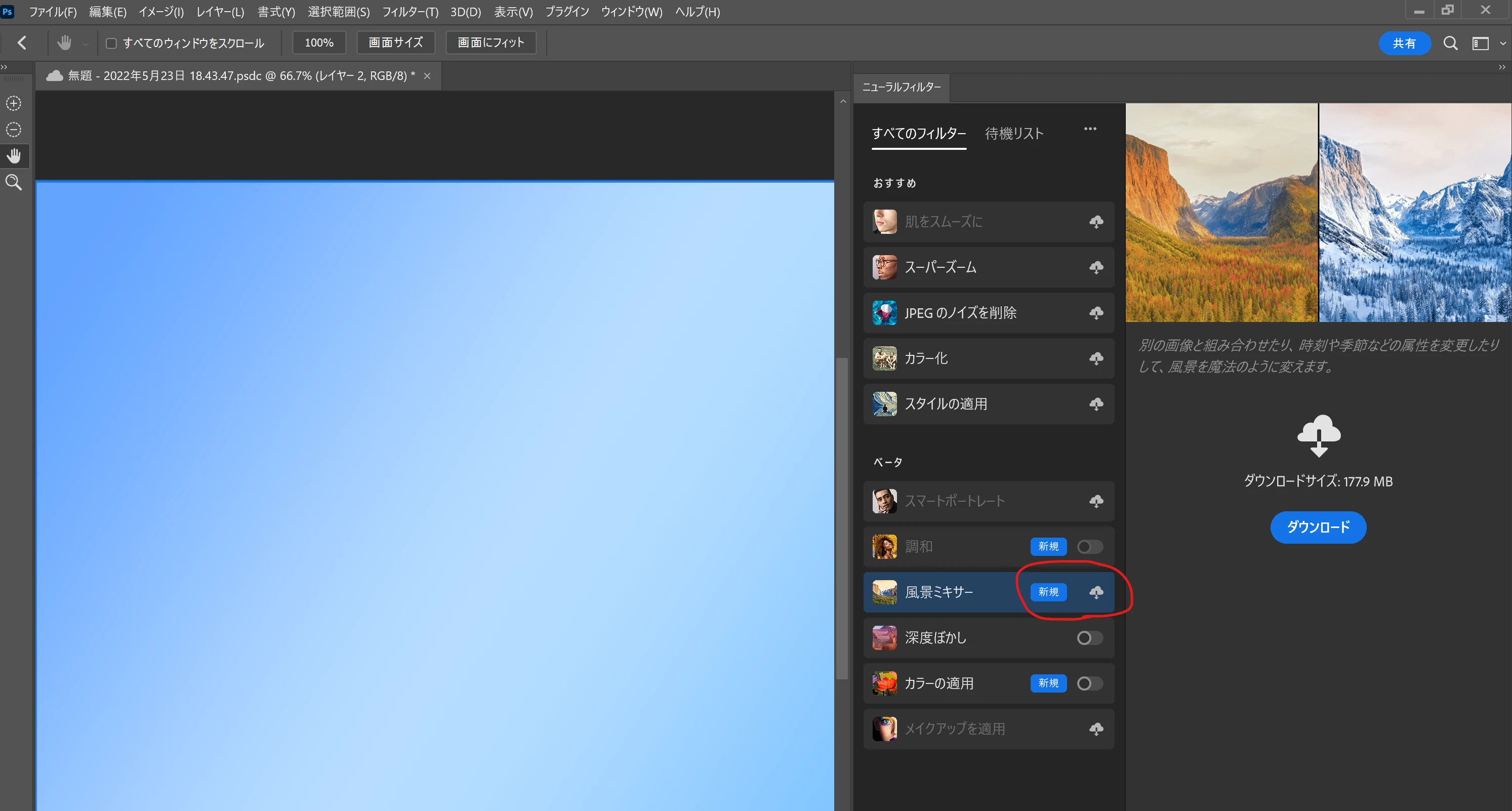 試してみたのですが、Photoshopのニューラルフィルターのダウンロードは順不同でもダウンロードできました。※「調和」と「深度ぼかし」を先に入れても、「風景ミキサー」のダウンロードが後から可能でした。