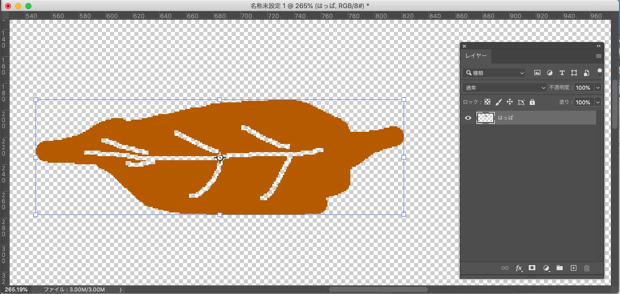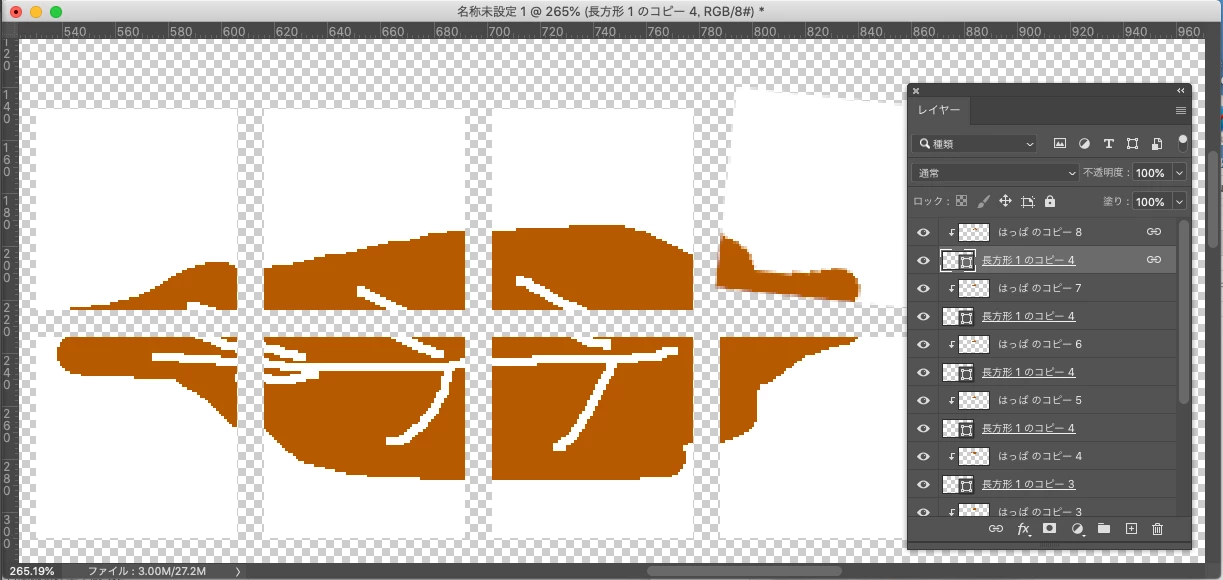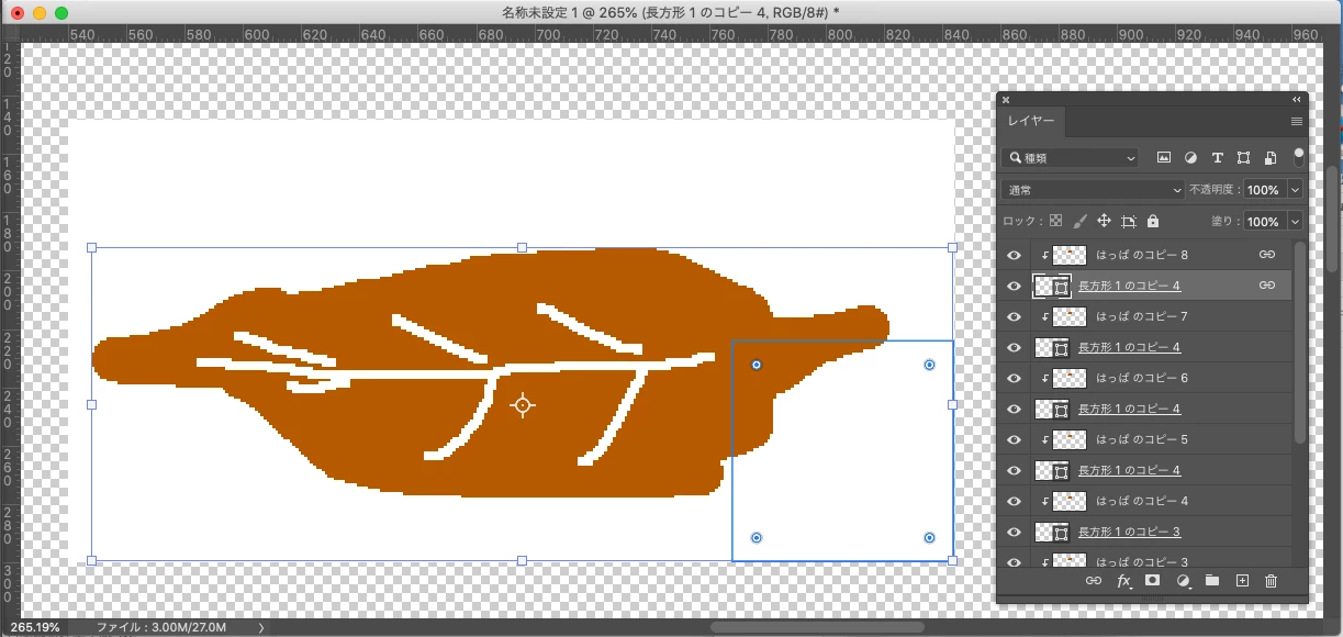 はっぱのレイヤーを正方形レイヤーそれぞれのすぐ前面に階層移動して、