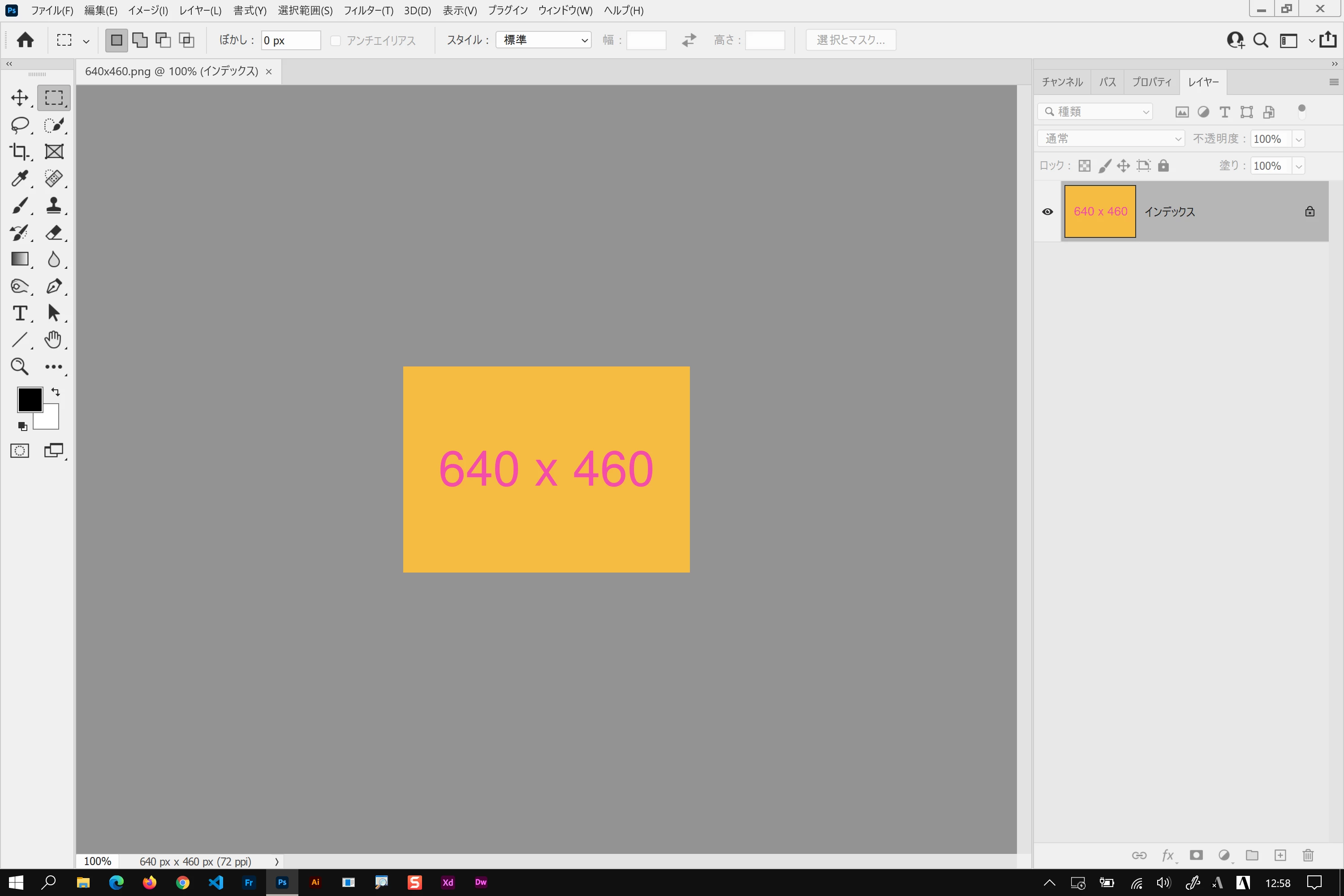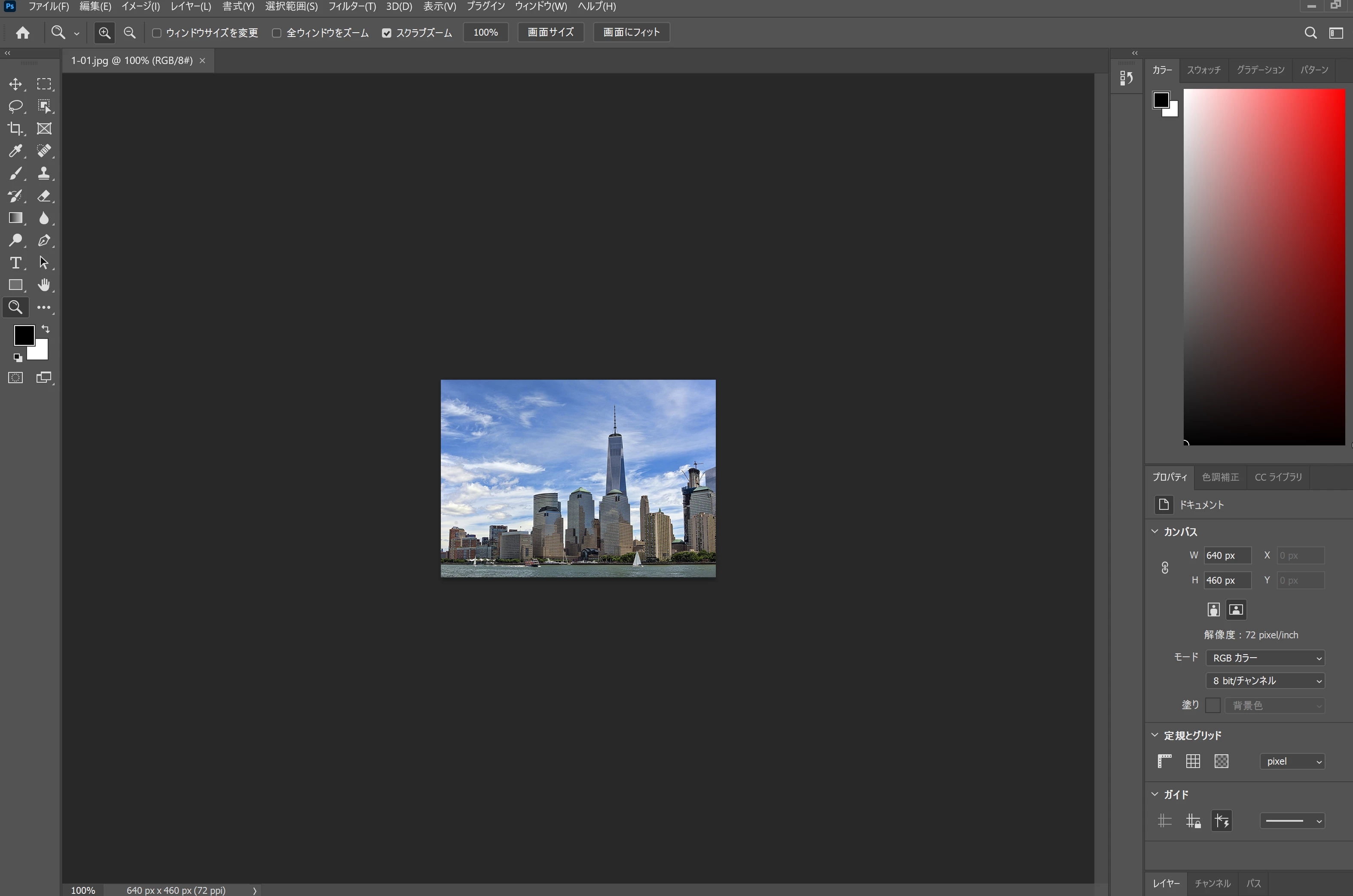 次の図は、640×460pxの画像をPhotoshopで100%表示している様子ですが、この画面キャプチャーから該当部分のピクセル数を調べると「640×460px」で表示されています。