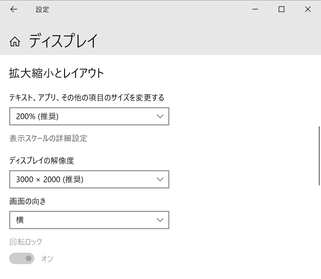 わたしの環境の場合、[テキスト、アプリ、その他の項目のサイズを変更する(画面の表示倍率)]を「200%」とし、ディスプレイの解像度を「3000×2000」としています。