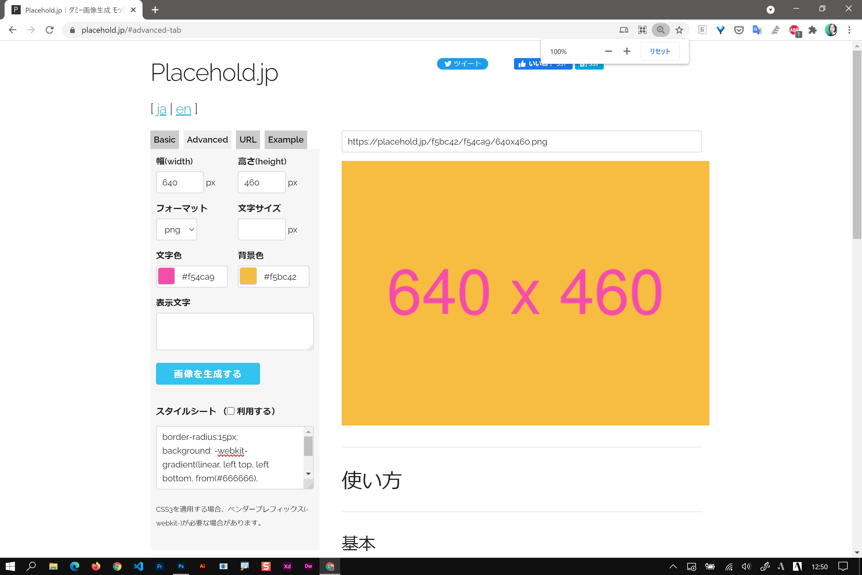 次の図では、placehold.jp(ダミー画像生成サイト)で「640×460px」を生成し、表示している図です。
