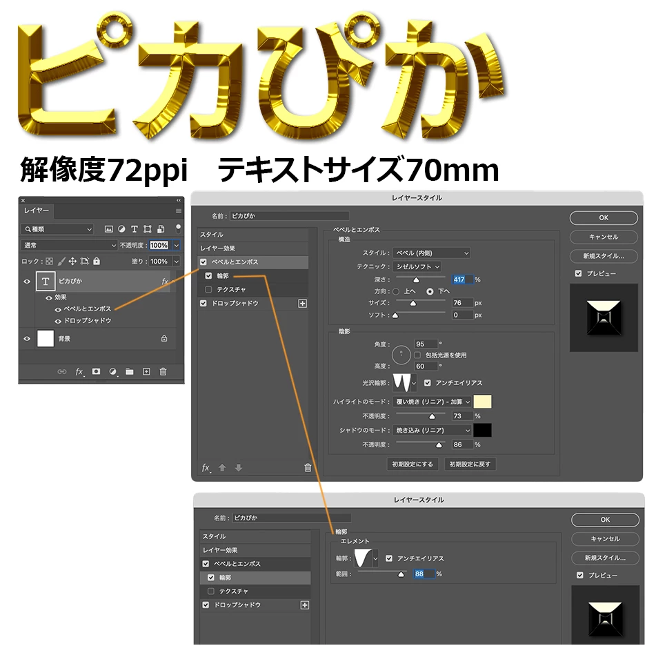 光沢感のある文字は、レイヤースタイル機能を活用することで作成可能です。
