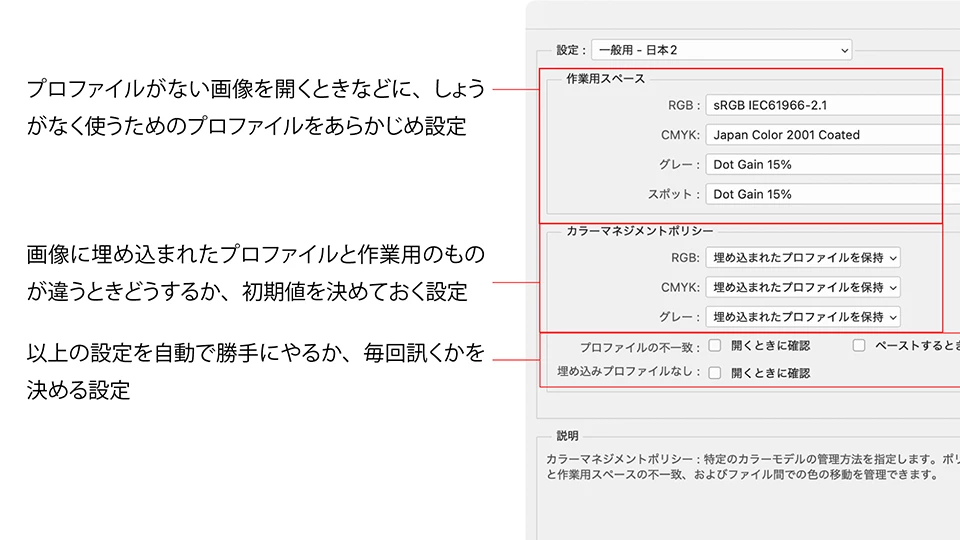 ・プロファイルが埋め込まれていればそれを使う(無ければJapan Color 2001 Coatedを無理矢理当てる→開いただけでも色が変わる可能性)