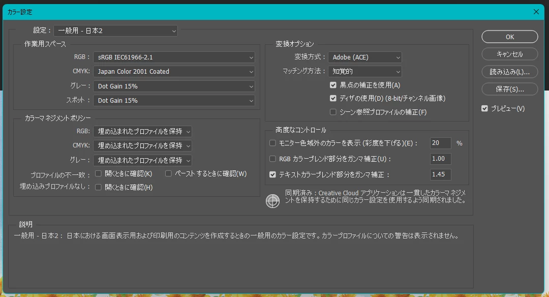 一応今使っているPhotoshopのバージョン、カラー設定の内容(作業用スペースのRGBとCMYKそれぞれと、変換オプションのマッチング方法と黒点の補正を使用の状態)を教えてください。
