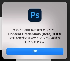 →「ファイルは書き出されましたが、Content Credentials【Beta】は画像に何も添付できませんでした。再試行してください。」と表示されます。