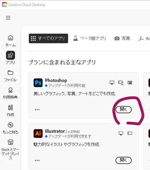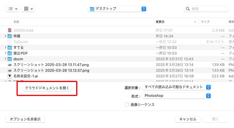 creative cloudから開くの画面