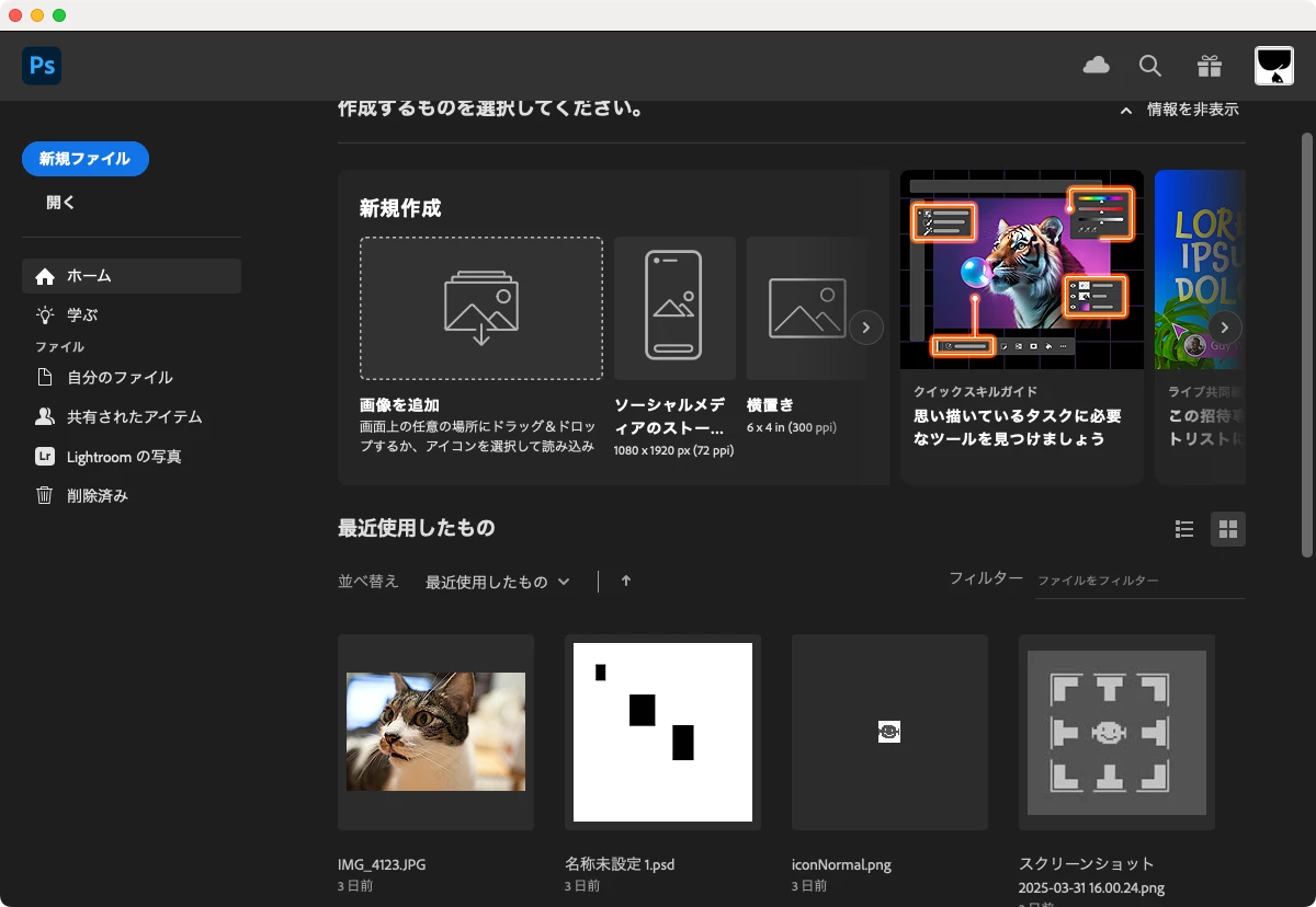お世話になります。何回かコンピューターのフォトショップファイルを開いて編集しているうちにcreative cloudから開くの画面が表示されなくなりました。元通り表示させたいのですが、いい方法はございませんか?どうぞ宜しくお願い致します。