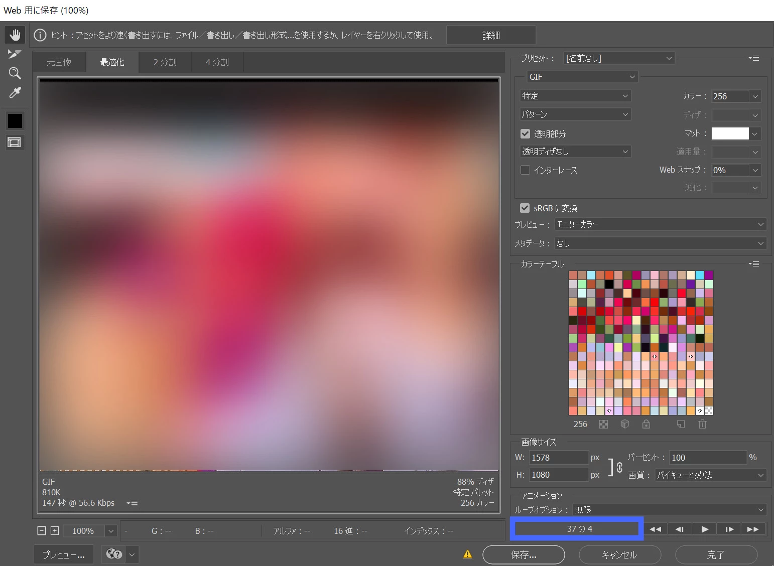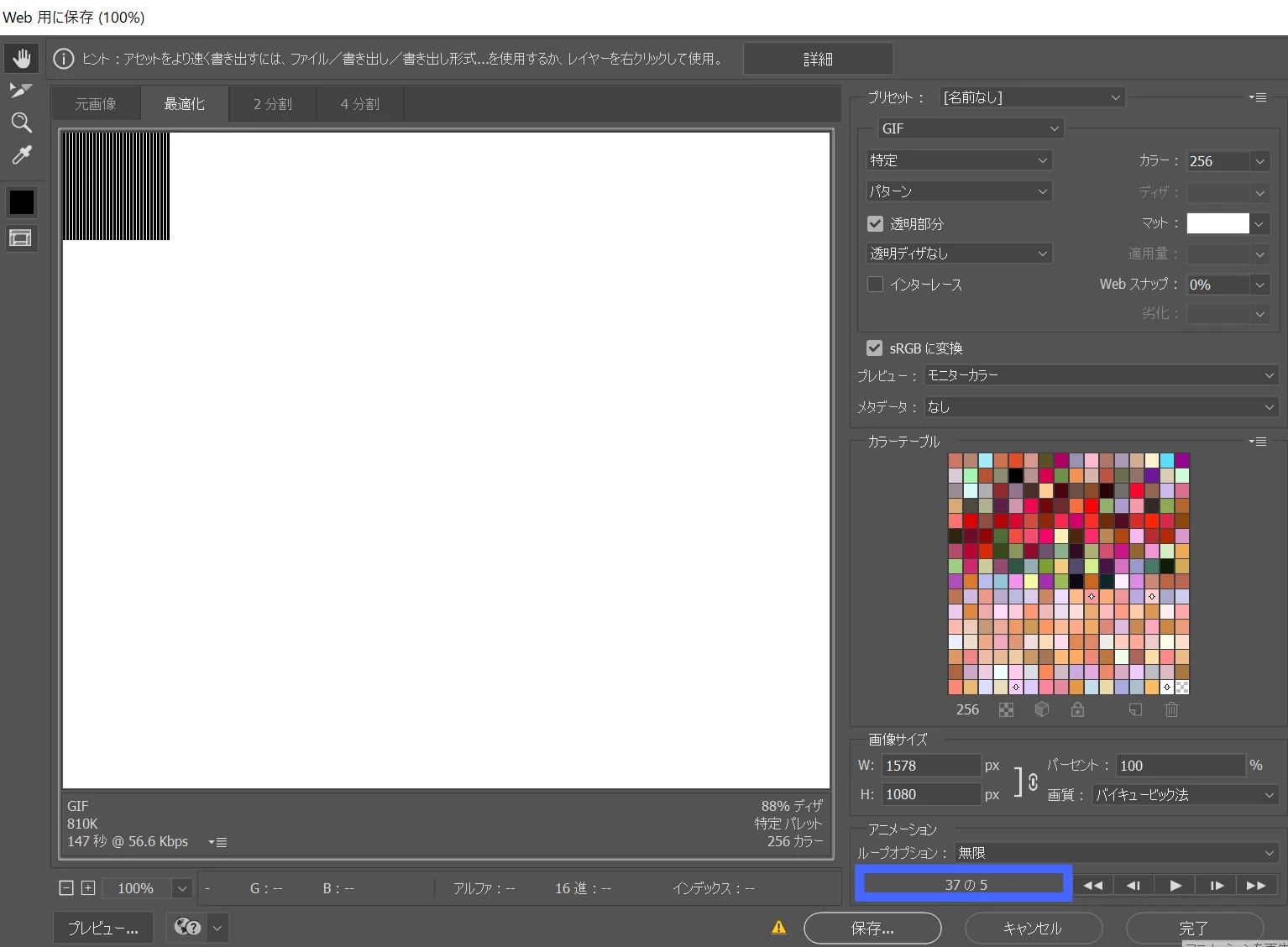 ・プレビュー結果に構わず、いったん書き出してみて、gifファイルをWebブラウザで評価できますか?