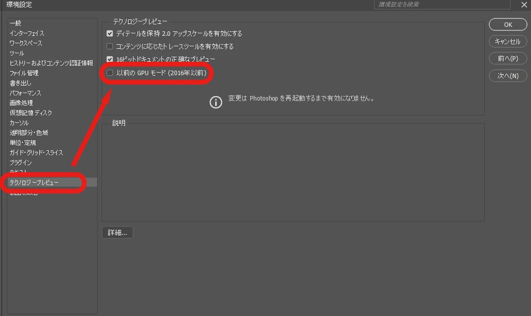■以前のGPUモードに切り替える(Photoshop・Windowsのみ)