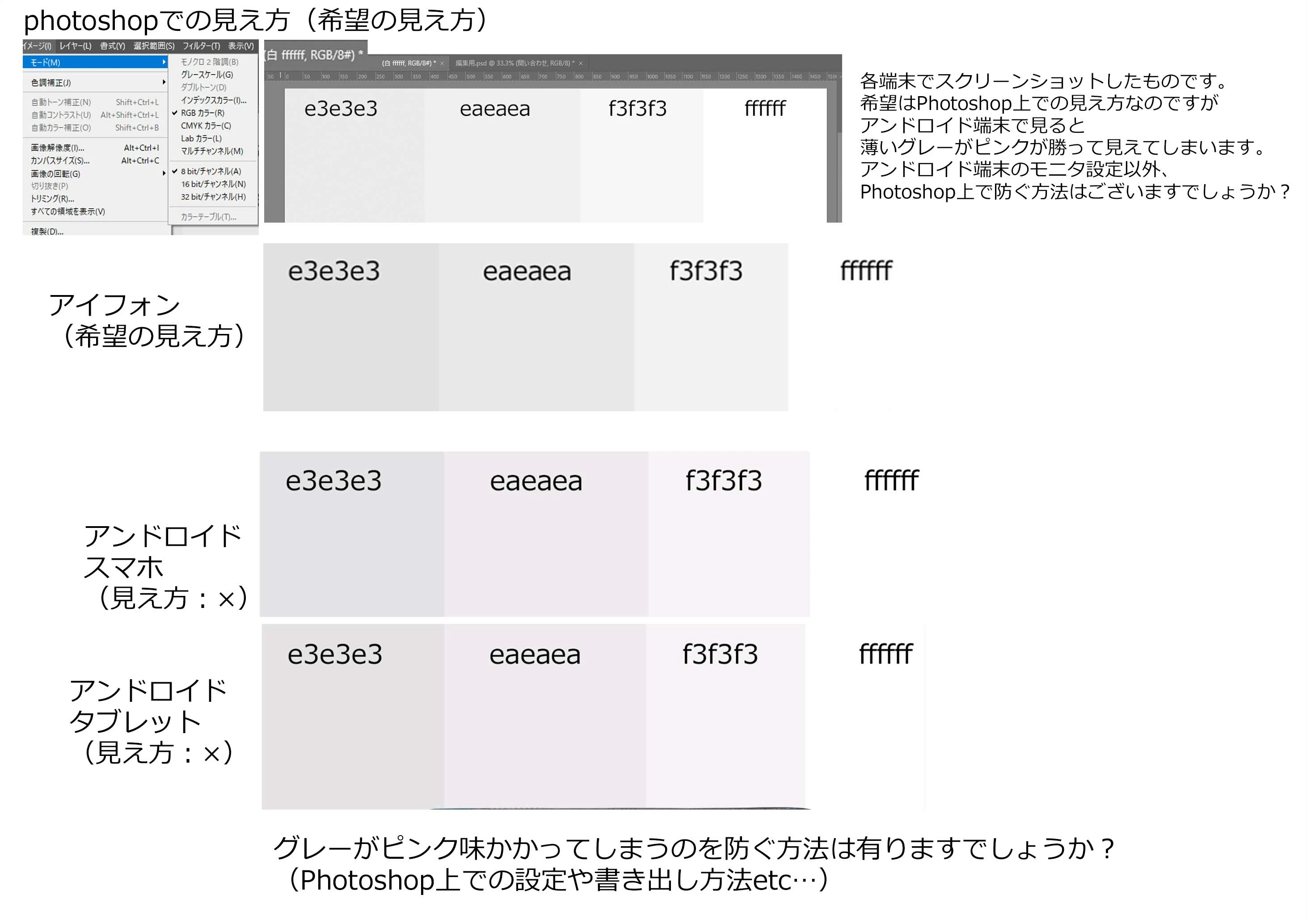 書き出したJPEGをアンドロイド端末で見ると【薄いグレーがピンクがかって見えて】しまいます。