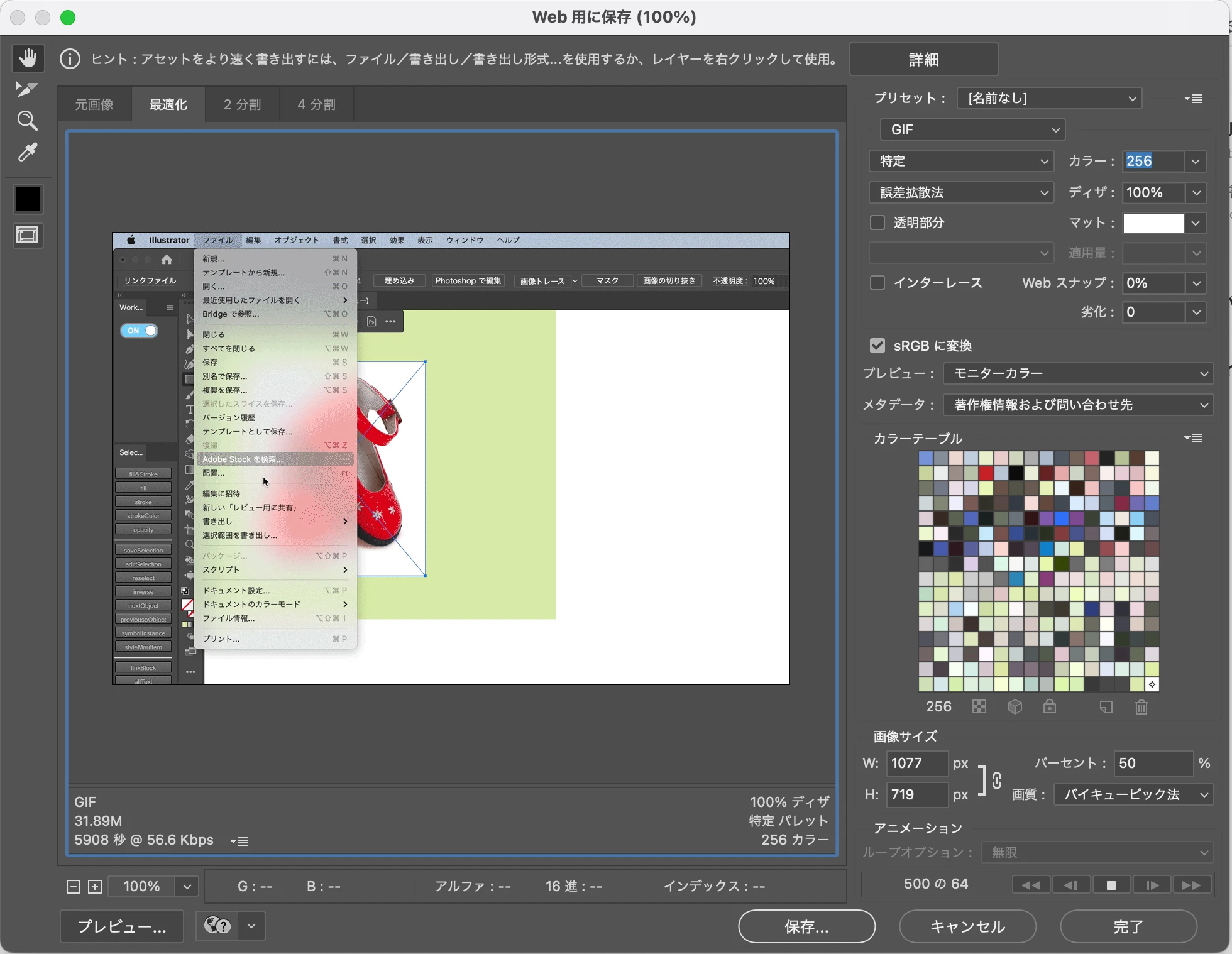 「web用に保存」のウインドウが出てくる