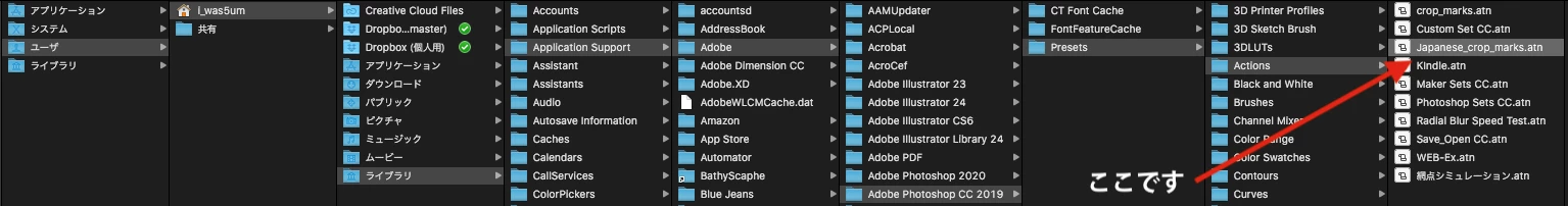 ダウンロードしたら解凍し [Japanese_crop_marks.atn]  を以下のパスに移動してください 。