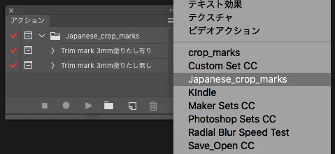 使い方:「Japanese_crop_marks.atn」をダウンロードし Photoshop の Presets に入れれば、アクションメニューから読み込める様になります。「Trim mark 3mm 塗りたし有り」と「Trim mark 3mm 塗りたし無し」の二つのアクションが有ります。