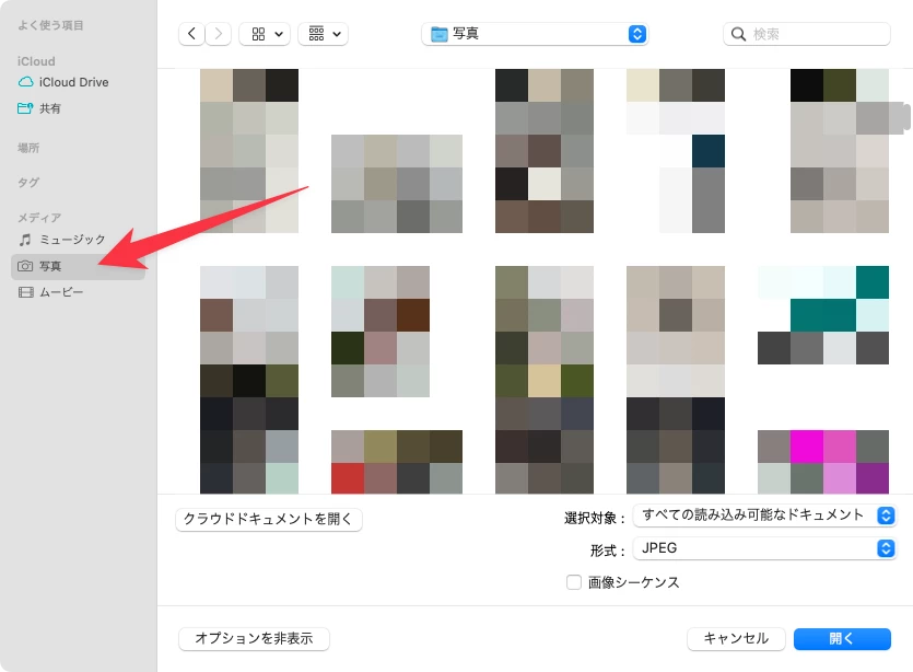 写真フォルダにある画像を、Photoshopの「開く」ボタンから取り込むと、