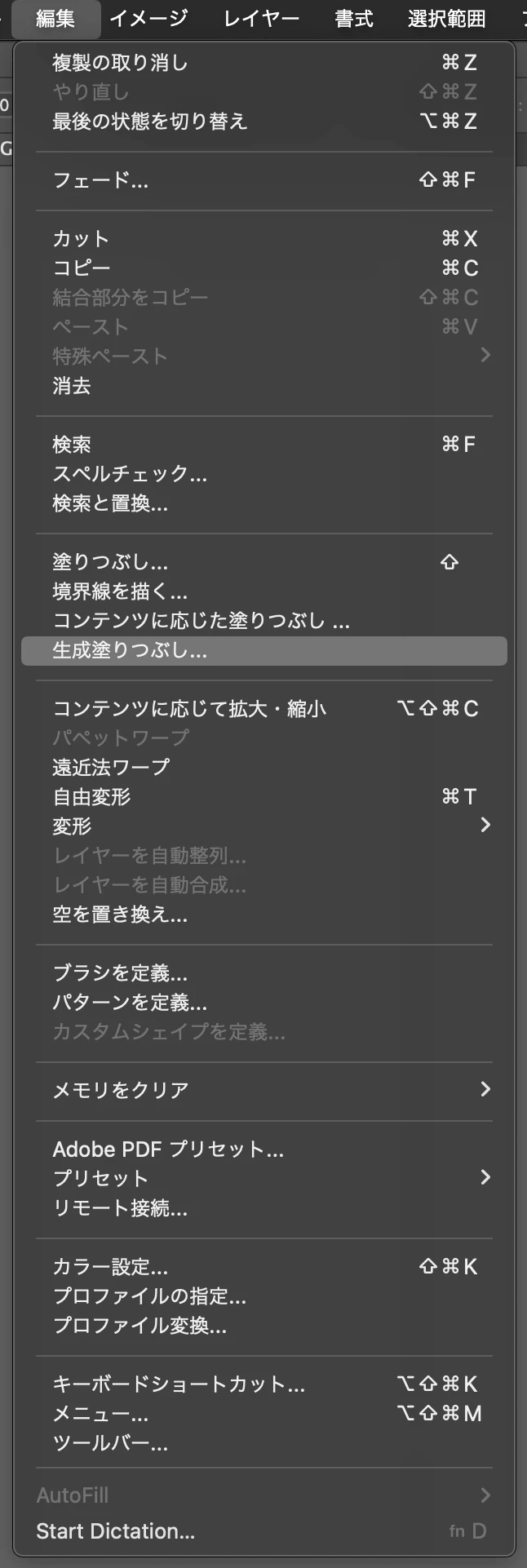 編集メニューには「生成塗りつぶし」があってそのメニューからなら生成塗りつぶしが出来ますか?