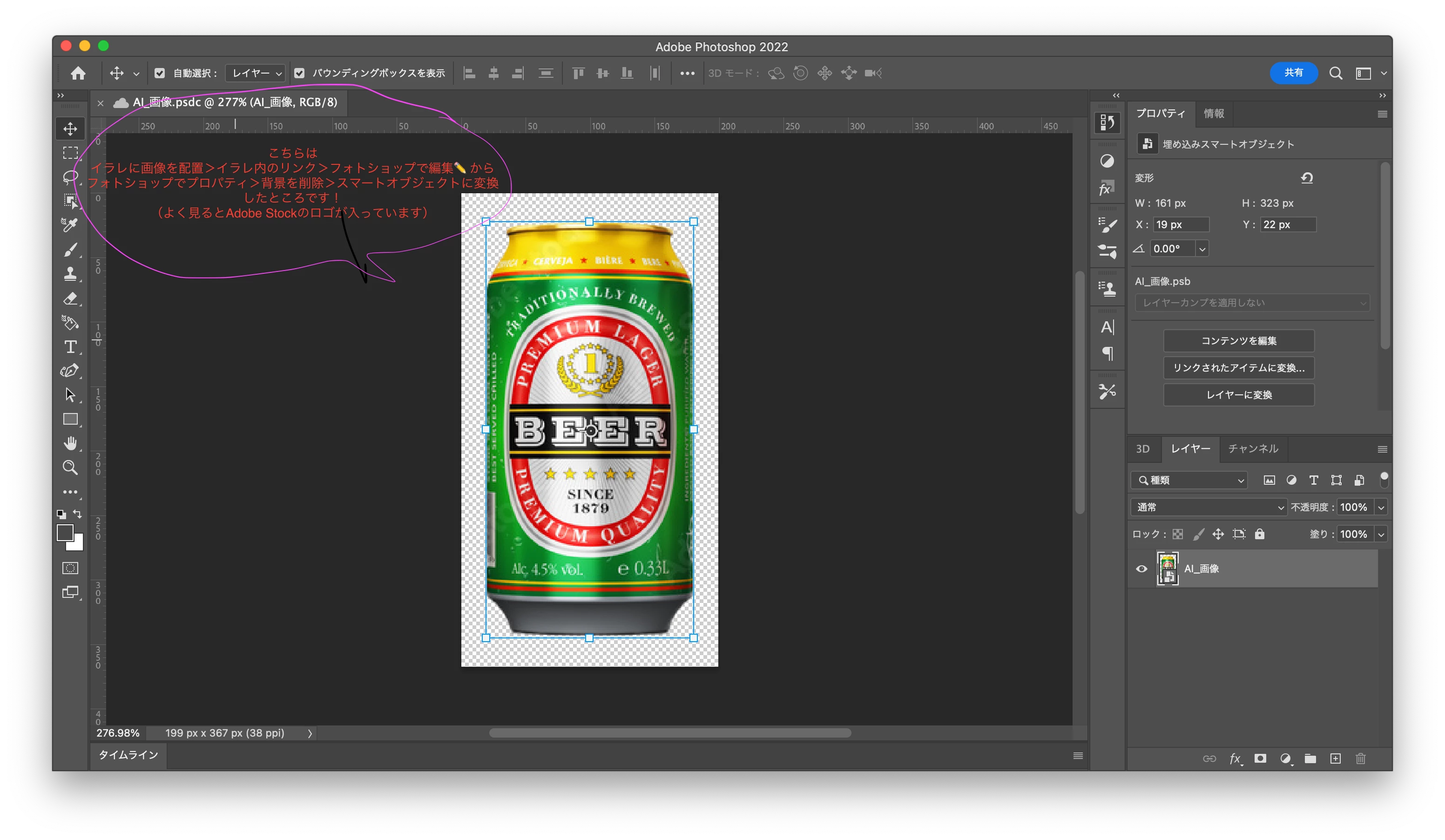 アピアランス>背景を削除 で切り抜きを行った後、