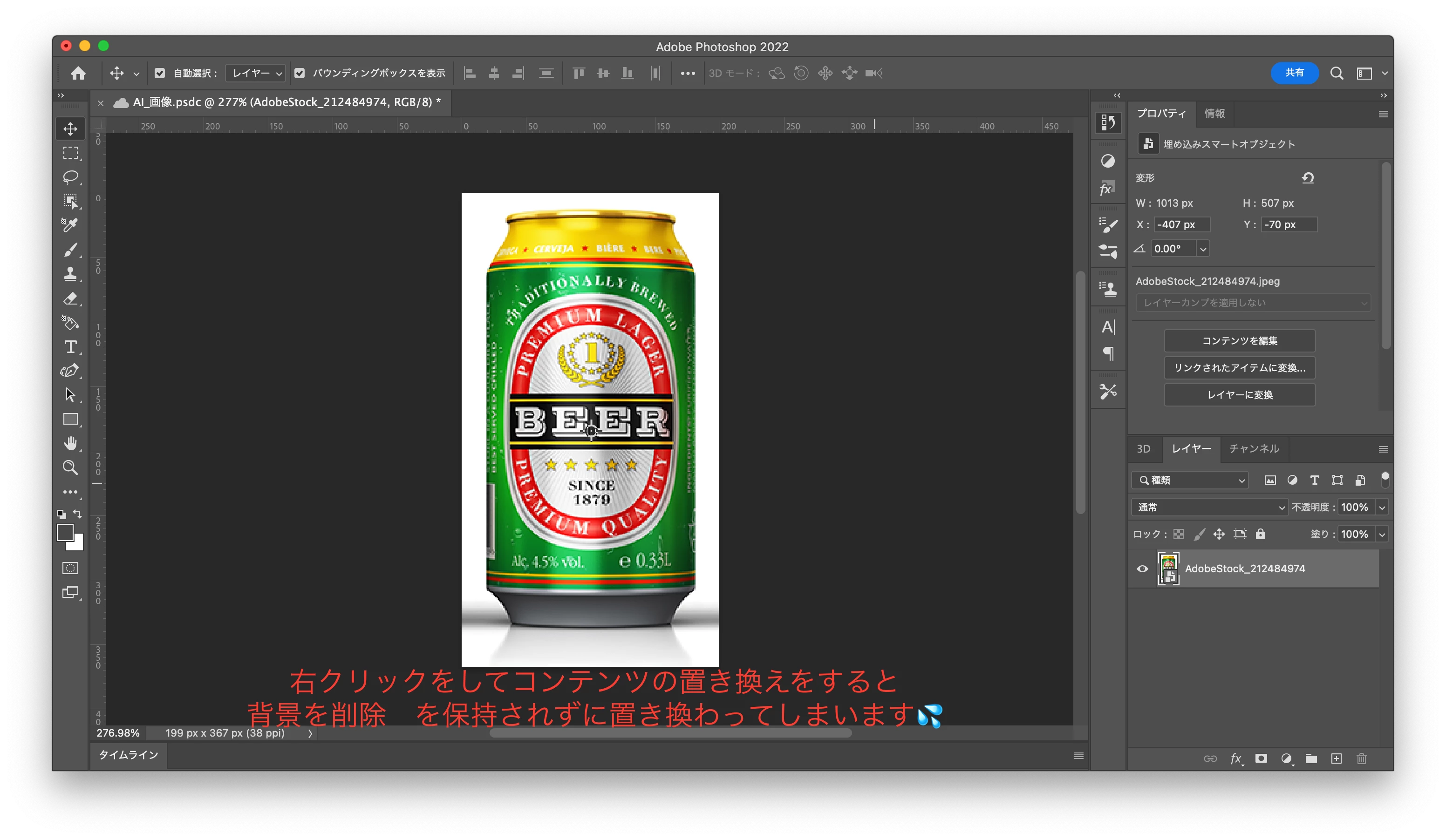 画像をコンテンツの置き換えをしようとレイヤーを右クリックしたところ、