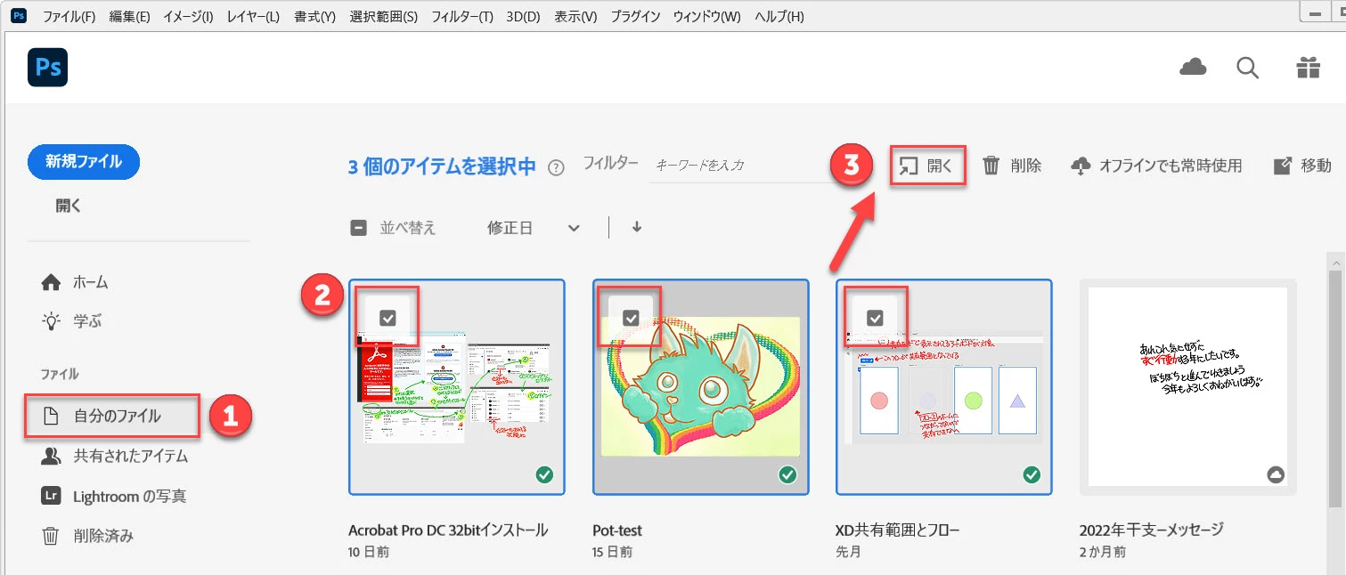 Photoshopのクラウドドキュメントの機能は知ってはいましたが、その様にファイルを選択してから開ける機能が含まれているとは知りませんでした。