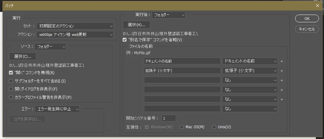 渚渚154AParticipantForum|Forum|4 years agoNovember 12, 2021QuestionPhotoshopの上でバッチ処理ができない。Forum|Forum|4 years agoNovember 12, 20212 replies3014 views使用アプリ:Photoshop v 23.0.1仕様:エディションのWindowsの10ホームバージョン20H2 OSビルド19042.662問題:Photoshopのの上でバッチ処理ができない始まった瞬間にプログラムエラーのポップアップが表示される。photoshopのみ異なる形式で保存されているのも気になります。(何度もtryしますがこの形式になる。)どなたかお知恵を貸してください。Windows