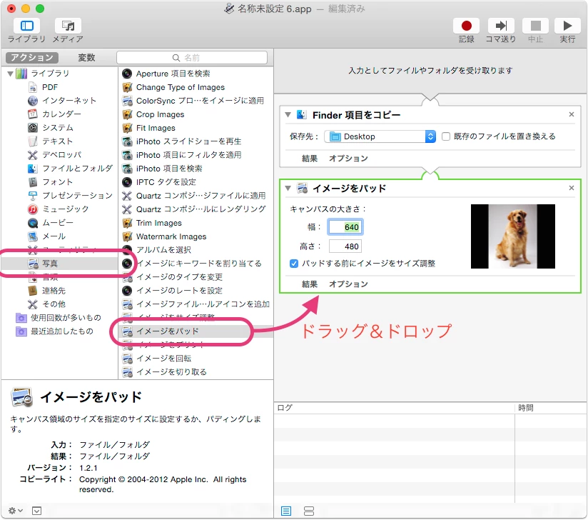 ⑥出来上がったアクションに、jpegファイルを全てドラッグ&ドロップすると、黒背景でサイズ調整された画像ファイルが、「Finder項目を…」で設定した保存先に全て出来上がってくるはずです。