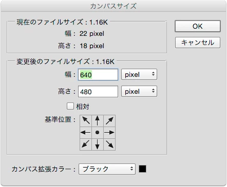②アクションを作成します。内容は、イメージメニュー>「カンバスサイズ」で、ここで使用サイズのPixelを設定します。