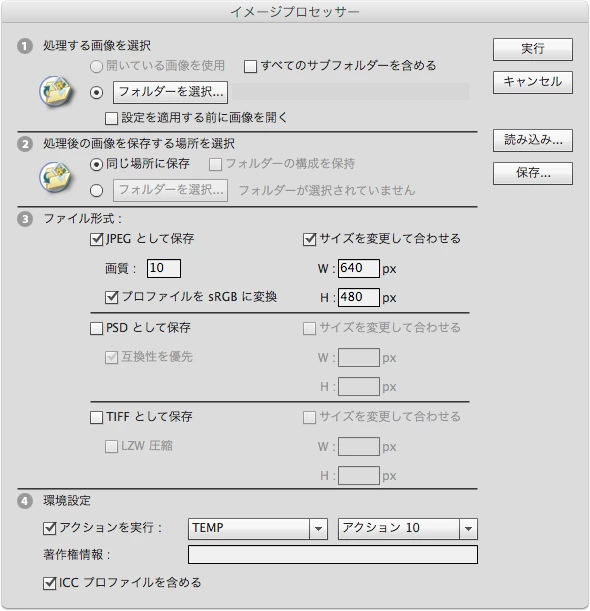 ③Photoshopのファイルメニュー>スクリプト>イメージプロセッサを開きます。
