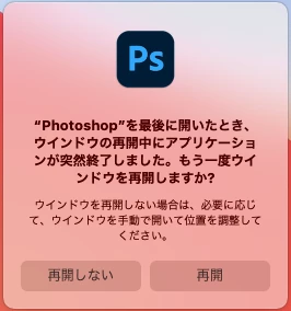 また、前回クラッシュしたことで、ウィンドウを再開するかどうかを聞いてきますが、「再開」「再開しない」いずれもクリックしても正常に立ち上げることができません。