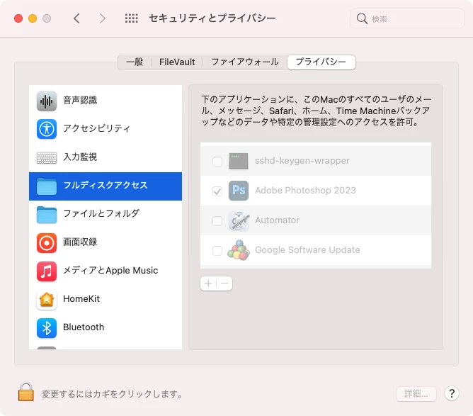 ご回答ありがとうございます。あまりにも基本的な機能が作動しなくてパニックになりましたが、Adobeのサポートに連絡して遠隔で操作していただきとりあえず解決いたしました。理由はフォトショップの設定が壊れていた+OSをMontereyにしたまま最新バージョンのフォトショップにアプデしてしまったので、外部モニターターのドライバが古いままで対応していなかったことでした。取り急ぎOSのアップデートせずにMonterey対応のフォトショップをインストールし直していただき、解決できました。外部モニターのドライバーは最新のOSをアップデートしたら自動でアップデートするらしいので早めにアップデートをしてくださいとの説明を受けました。外部モニターをマックブックから外したら不具合は解消できていたそうなのでフォトショ側の問題ではなかったとのこと。使いたかった外部機器を優先するのではなく最新OSを優先にしたほうが全てにおいて良いのですね。古いOSでしか使えない機器に関しては、外付けHDに起動ディスクをいれてその都度対応して今後は全てAdobeのソフトをスムーズに使えること最優先で考えることにします。教えていただいたフルディスクアクセスのフォトショップのところ、チェックが外れていたので、入れてみました。まさかアプデで保存ができないという前代未聞の緊急事態でしたが、アドバイスいただけてとても心強かったです。ありがとうございました。