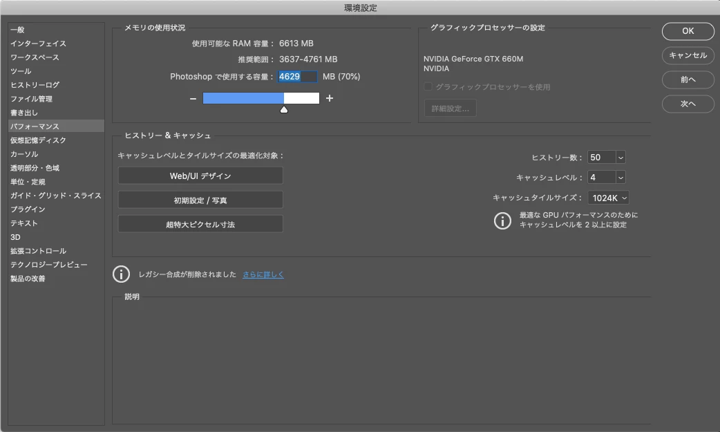 環境設定 > パフォーマンス > グラフィックプロセッサーの設定を見てみますと、チェック項目がグレーアウトしており、選択できないようになっております。