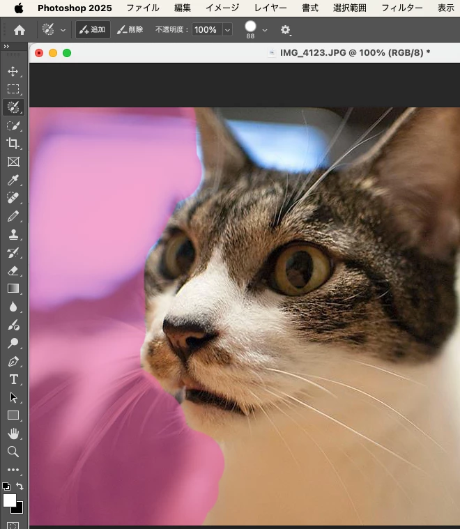 「クイックマスクを使用」状態で、ブラシツールで範囲選択し、画像を部分補正する手段をこれまで多用していましたが、Photoshop2025リリースのタイミング(?)で、使用できなくなり、困っています。
