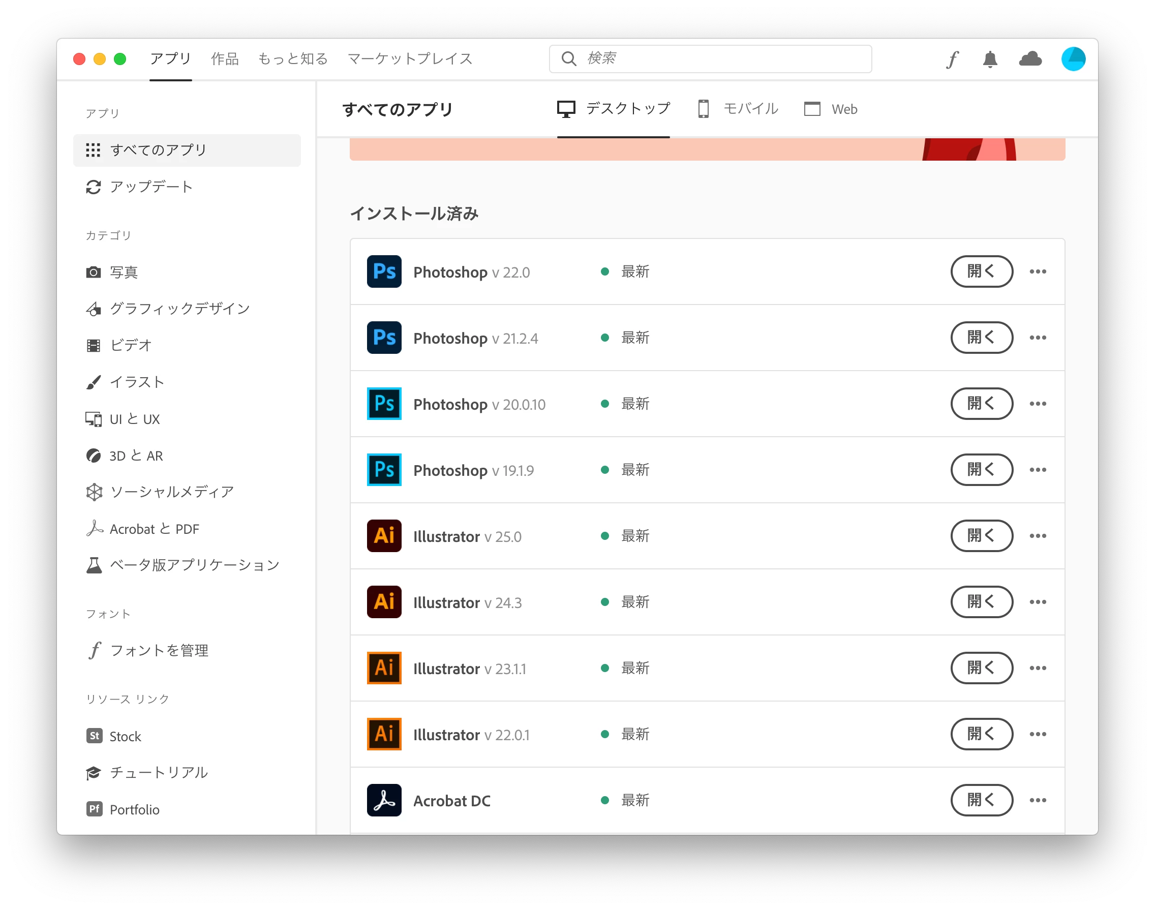 しかしやはり最新バージョンにしようと思い、久しぶりにクリエイティブクラウドにログインし、アップデートを確認したところ