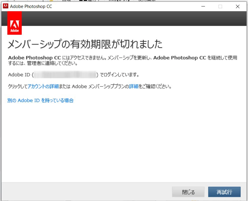 PhotoshopCS6を開こうとすると、CCの「メンバーシップの有効期限が切れました」というメッセージが表示されます。