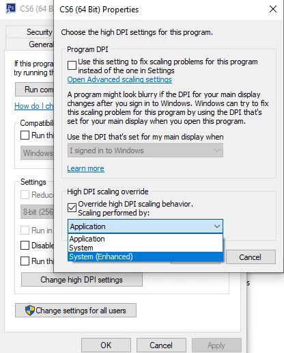 参考になるかわかりませんが、photoshop2020.exeのプロパティ→互換性→高DPI設定→高DPIスケール設定を上書きを アプリケーション システム システム拡張 いずれに変更しても効果ありませんでした。