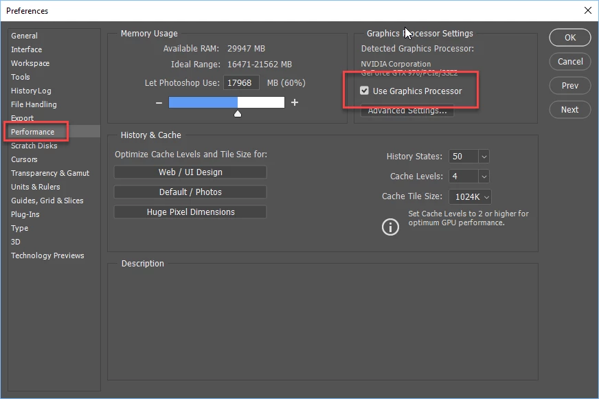 If the Oil Paint filter is not working, check to make sure the GPU is enabled in Preferences. You must have a compatible graphics card: