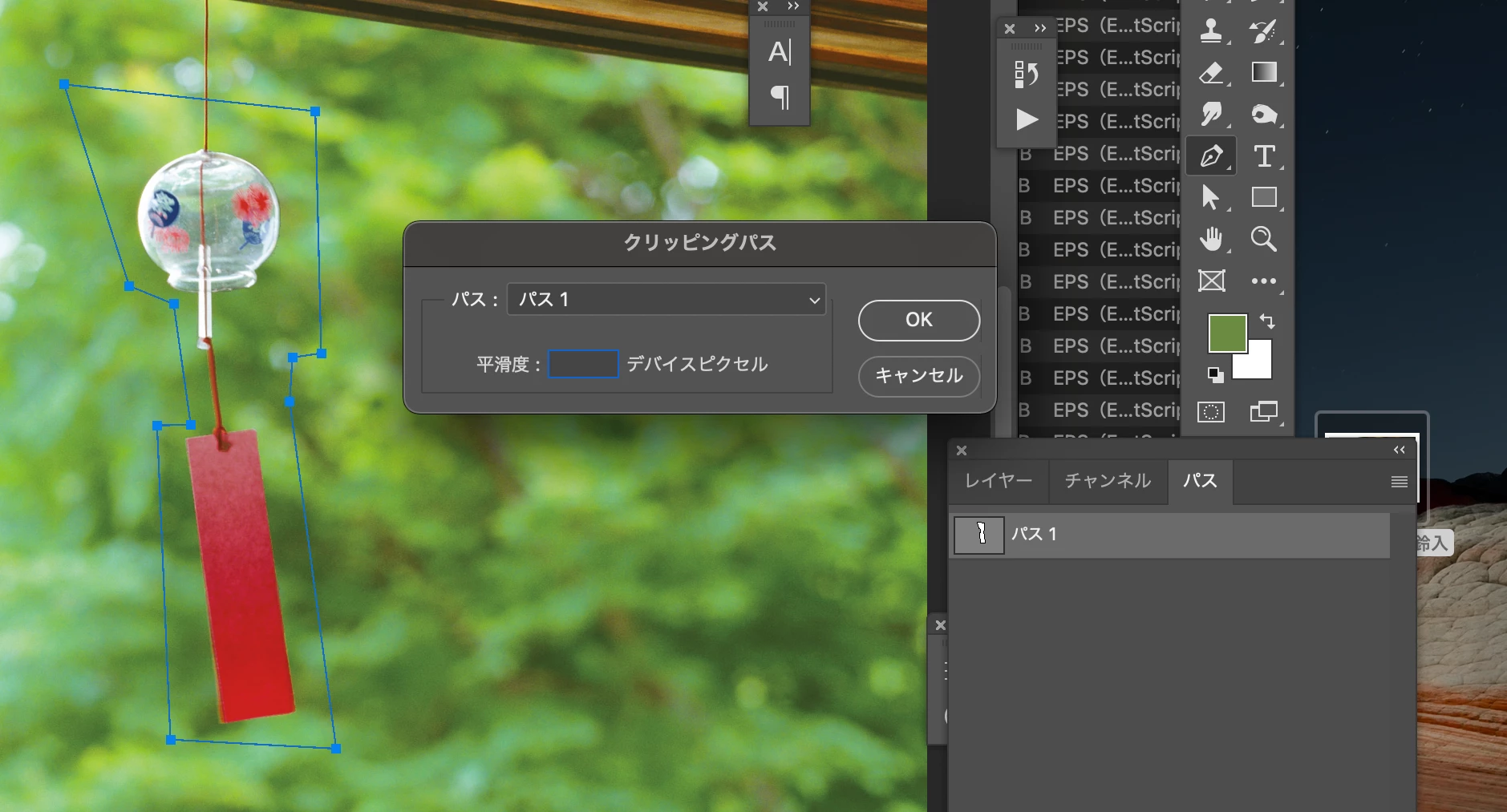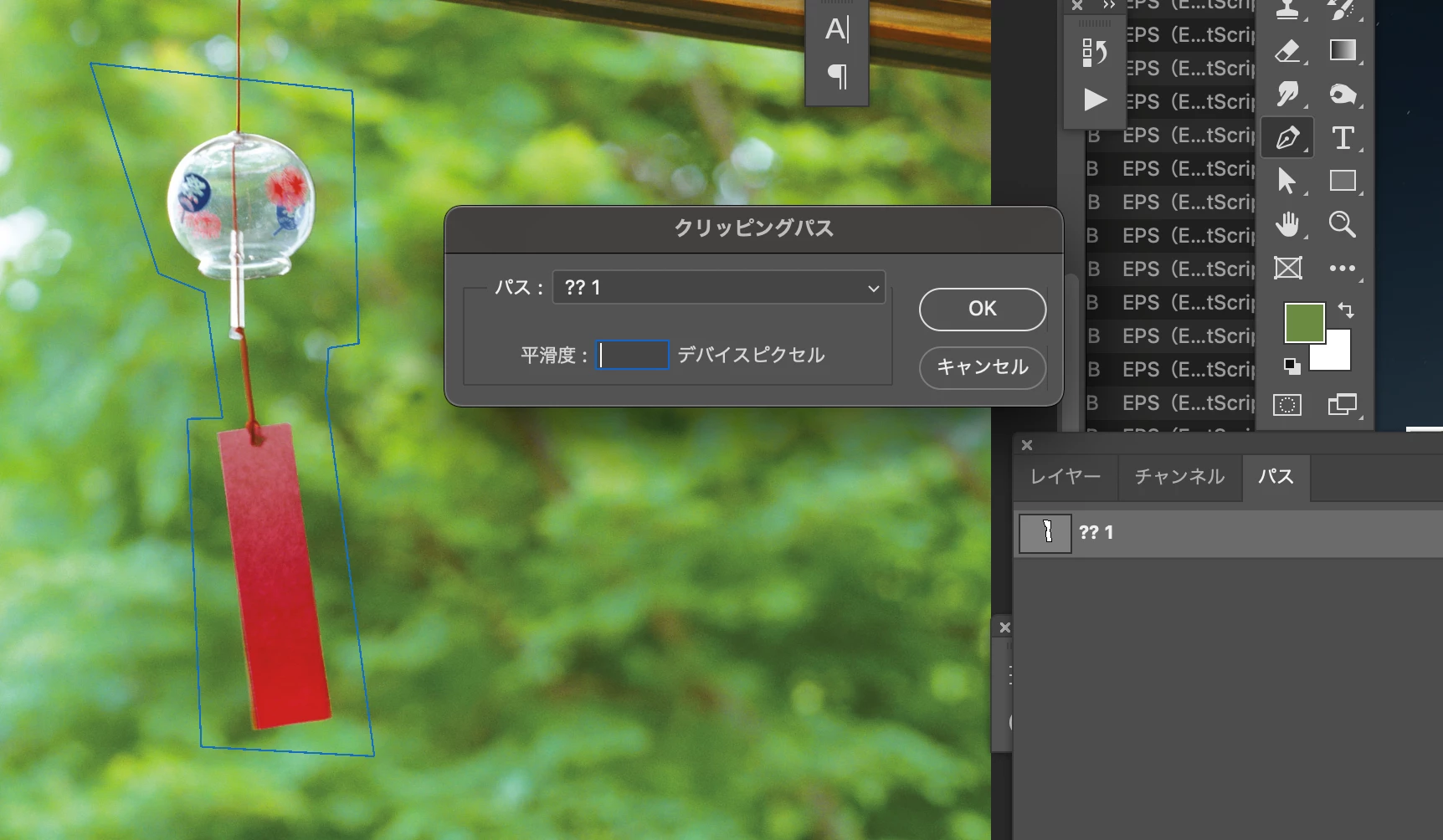 色々試した結果、EPSファイルに保存し直して、もう一度フォトショップで、そのEPSファイルを開くと、クリッピングパス名が文字化けしています。