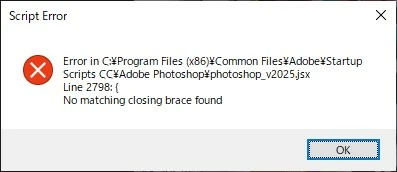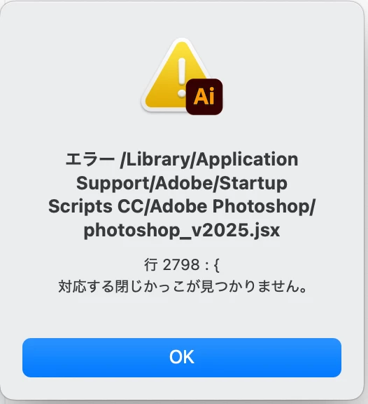 組組版5FE6Participating FrequentlyForum|Forum|10 months agoMarch 28, 2025Questionv26.5(Win)インストール後、Photoshop以外の起動時にエラーメッセージForum|Forum|10 months agoMarch 28, 20255 replies1918 views3/28本日v26.4.1をv26.5に上げると、Illustrator・InDesignの全バージョンで起動時に添付のようなエラーメッセージが出るようになりました。但しこのままOKで進めても、今のところ特に問題は起きていません。 アップデート時に、Program Files(x86)にある不可視ファイルjsxを、ブレスを閉じていない不完全な記述のもので置き換えてしまっているようです(そもそも必要なファイルなのか)。v26.4.1に戻せば出なくなります。 大して問題は出ていないのですが、とりあえずご報告を。Windows