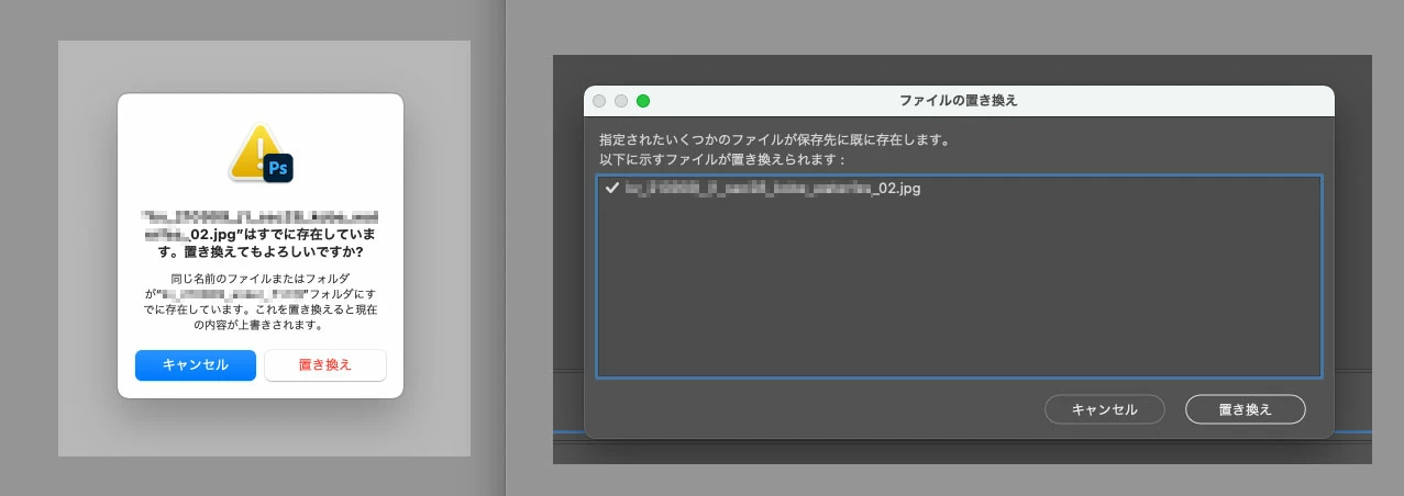 「上書きしますか?」ダイアログが、OSのUIとPhotoshopのUIで、2回表示されます。