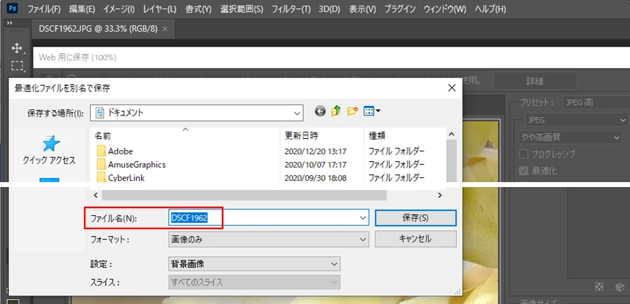 Web用に保存でファイル名が拡張子まで選択される