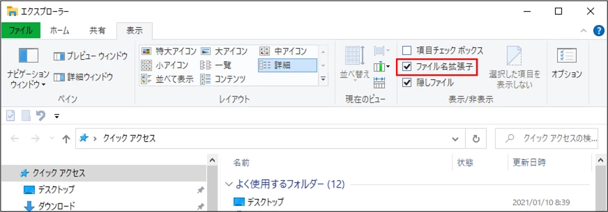 エクスプローラのヘッダー部分で、「表示」を選択し、「ファイル名拡張子」にチェックを入れると、上記画面で拡張子が表示されます。