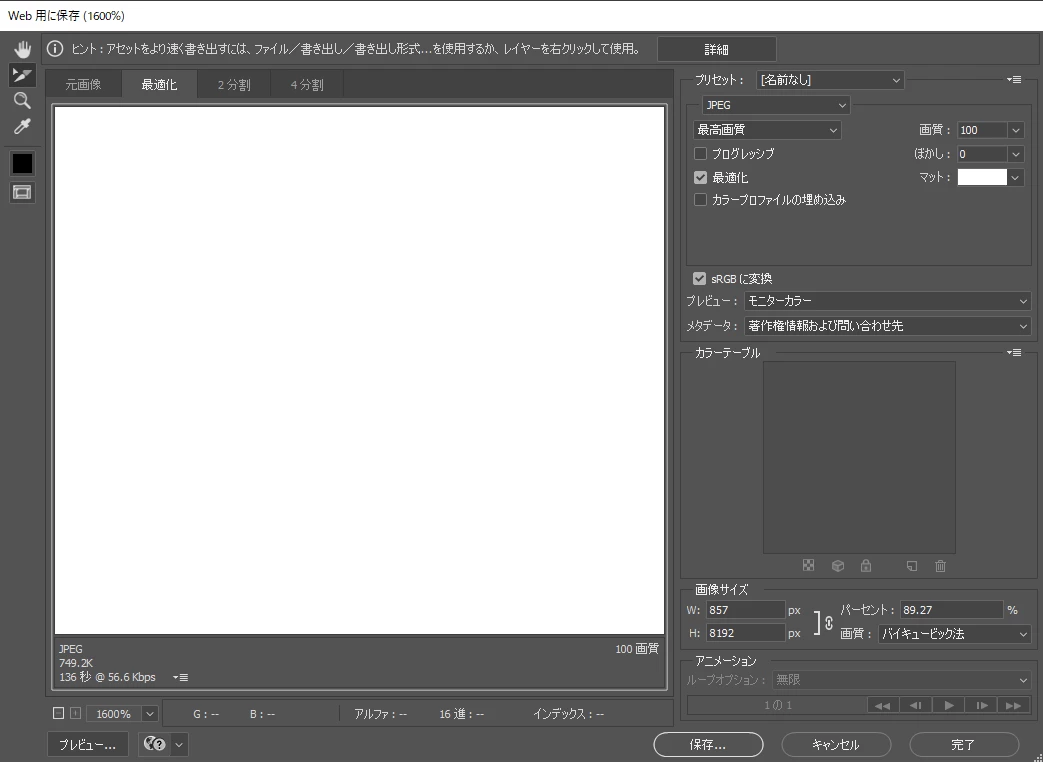 ファイル>書き出し>WEB用に保存にて、保存を押して、