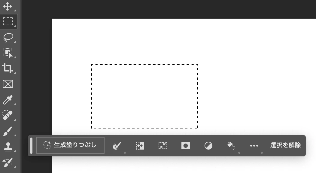 ただ、手順2番目の長方形選択ツールで画像の一部を選択後、コンテキストタスクバーは出ないままです。コンテキストタスクバーはある方がとても便利ですが、上のメニューからでも生成塗りつぶしが使えるようになってよかったです。