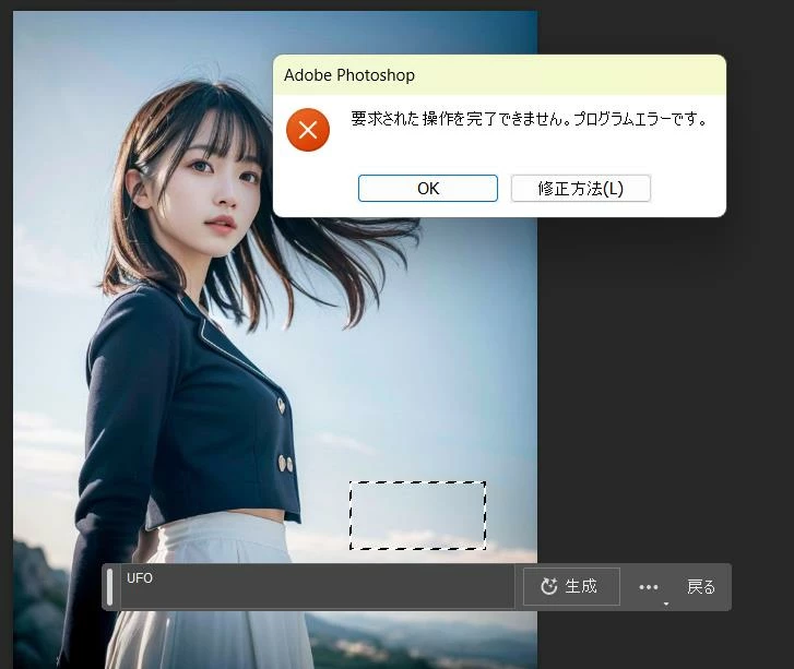 現在同じように「ジェネレーティブ塗りつぶし」ボタンがグレイアウトされてしまいます。