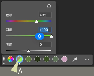 ピクセルレイヤー選択時にコンテキストタスクバーが表示され、上図のように「カラーを調整」ボタンがみられます。ボタンをクリックすると開いている画像の6つの主要なカラーが表示され円で表示されます。それぞれのカラーの円をクリックすると画像のその色が該当する部分で色相、彩度、明度を調節できます。スライダーを動かすとプレビューがカンバス上でライブで表示されます。その円のカラー(下図内 A)もそれに合わせて変更しビフォー・アフターの2色が表示されます。