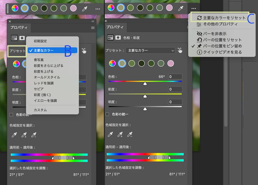 「主要なカラー」はプロパティパネル内の色調・彩度のプリセットのプルダウン(下図内B)からもアクセスできます。