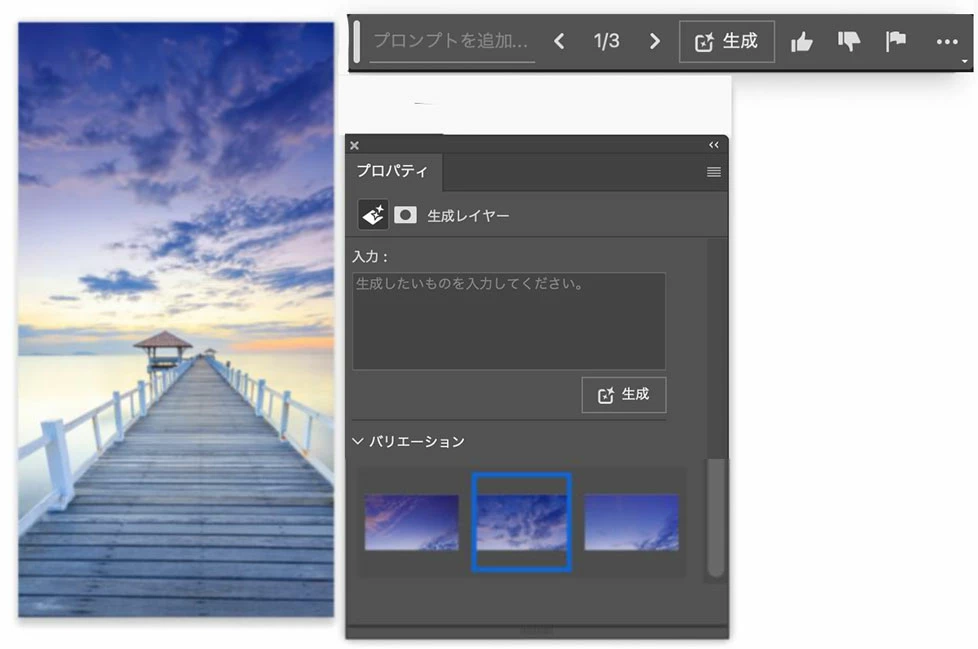 6. コンテキストタスクバーにある矢印をクリックして作成されたバリエーションを表示して選択。又はプロパティパネル内のサムネイルのプレビューから選択する。