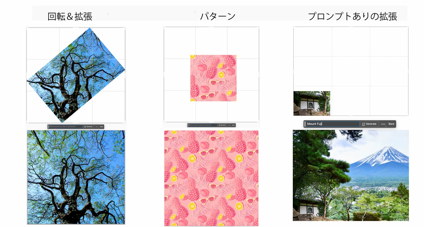 • 画像の拡張:画像の拡張をプロンプト(テキスト入力)なし、プロンプトありで行え、元画像に合ったシームレスな拡張が行われます。(下図ではMount Fujiと入れています。)