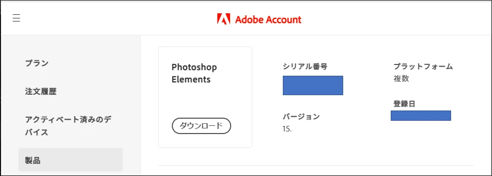 Photoshop Elements 15を製品登録してあれば、Adobe HPのアカウント管理からシリアル番号を知ることができます。また最近ではそこからダウンロードもできるようです(以前はダウンロードのボタンがありませんでした。)。