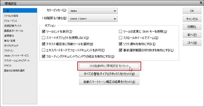 ①メニューの「編集」→「環境設定」→「一般」を選択し、開いた「環境設定」ウィンドウで「次の起動時に環境設定をりセット」(下図赤枠部)をクリックし、「OK」を2回クリックして元の画面に戻します。