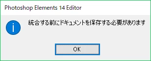 Photoshop Elements 14で、パノラマ写真を作成しようとして、元写真を選択したのち、「パノラマを作成」をクリックすると、合成が進まないで、「Photoshop Elements 14 Editor」の窓が開き、「統合する前にドキュメントを保存する必要があります」とのメッセージがでます。この意味が理解できないので先に進めません。対処法についてお教えいただきたいと思います。