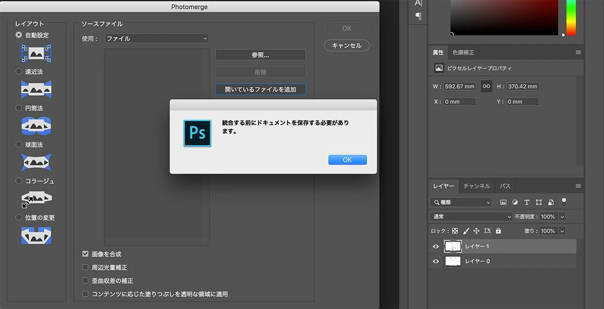 パノラマ作成の前に「統合する前にドキュメントを保存」とは?